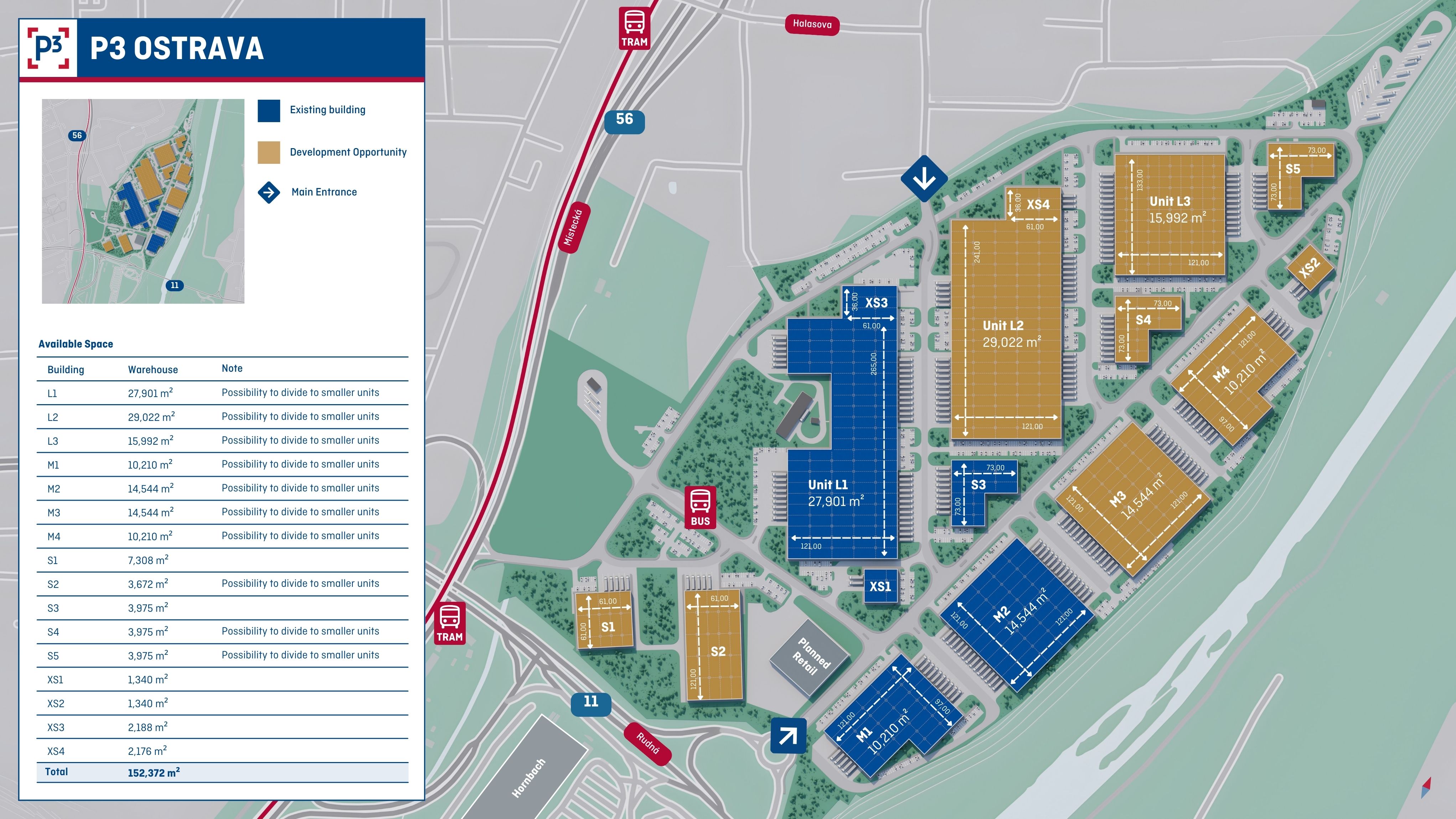 Moderní logistický park P3 Ostrava a jeho strategická poloha zajišťuje výbornou dostupnost jak z centra Ostravy, tak i z přilehlé obchodní čtvrti. Celý park o rozloze 44ha prošel náročnou sanací, po které byl skvěle připraven na výstavbu obchodně-průmyslového parku, který vrátil do opuštěné lokality život a stal se součástí města. Díky návrhu oceňovaného architekta Davida Kotka (společnost PROJEKTSTUDIO) průmyslová zóna přirozeně navázala na nedaleké centrum i na unikátní podobu Aglomerace, kterou jí vtiskl architekt Josef Pleskot. Stavíme s respektem k historii i okolní zástavbě.