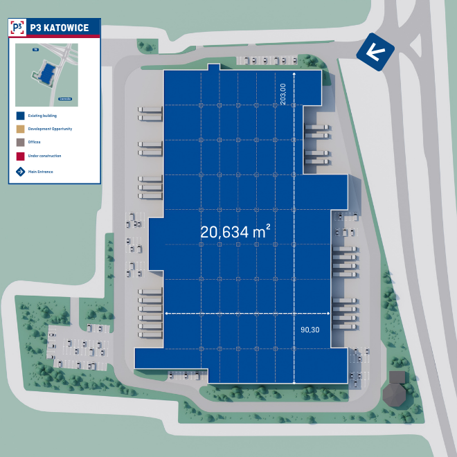 P3 Katowice City is a modern warehouse park located on Lwowska Street, in the eastern part of Katowice, right next to the exit from national road No. 79. On a 4.7-hectare plot, there is a modern warehouse facility with an area of 25,000 m², designed for tenants for whom proximity to the city center is a key factor.