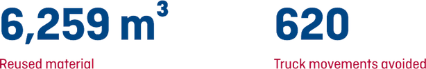 Only 18.3% of material required external handling. This approach significantly reduced the need for virgin aggregates and avoided over 620 truck movements, cutting transport emissions and local disruption.