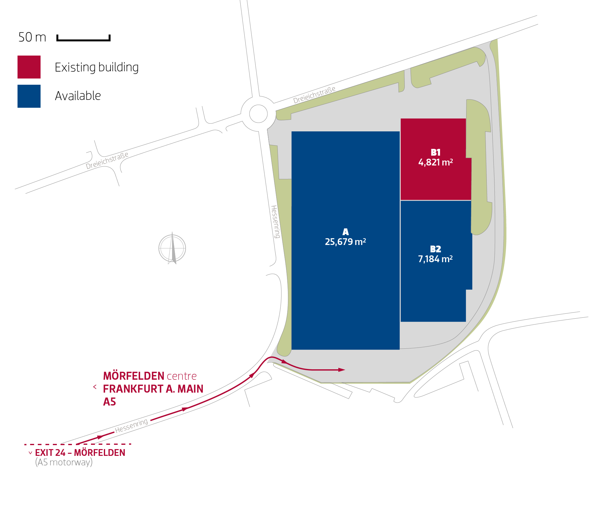 Die Immobilie liegt etwa 20 km südlich vom Stadtzentrum von Frankfurt am Main und 10 km vom Frankfurter Flughafen entfernt. Sie befindet sich direkt an der Anschlussstelle zur Autobahn A5. Das Gebäude ist rechteckig mit einer Breite von etwa 100 Metern und einer Länge von etwa 200 Metern. Die Hauptbürofläche liegt am nördlichen Ende über dem Wareneingang. Die lichte Deckenhöhe liegt bei 8,5 Metern. Der Anbau ist rechteckig mit einer Breite von etwa 60 Metern und einer Länge von etwa 200 Metern. Die lichte Deckenhöhe liegt bei 11,5 Metern.
