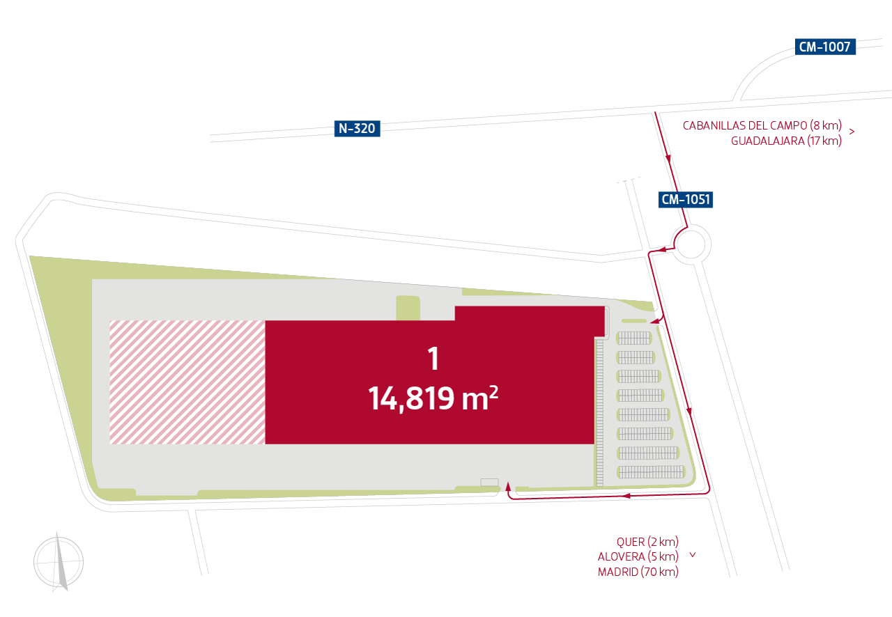 Diese Logistikimmobilie befindet sich in Quer, in der Provinz Guadalajara. Das Grundstück befindet sich im A2-Korridor, dem wichtigsten industriellen Hub des Landes, der Madrid und Barcelona miteinander verbindet. P3 Quer liegt in der Nähe der Autobahn R2 und etwa 50 km vom Stadtzentrum Madrids entfernt. Namhafte Unternehmen in dieser Region sind Factor 5 (3PL), Quilosa, Makro und DHL.