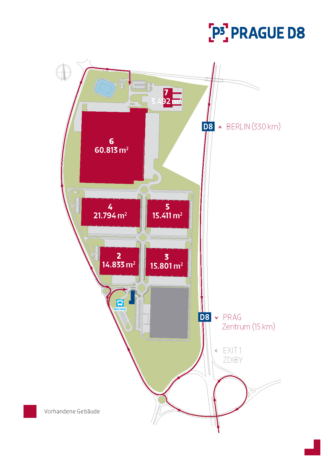 P3 park Prague D8 befindet sich ca. 10 Minuten vom Prager Stadtzentrum entfernt an der Abfahrt 1 (Zdiby) der Autobahn D8 (Prag – Dresden – Berlin) – er ist nicht zu verfehlen. Der park ist mit den Bussen der öffentlichen Verkehrsbetriebe 370 und 372, die den park mit der Metro C - Kobylisy verbinden, bequem zu erreichen. Der Bau des Parks begann im Februar 2004. Mittlerweile wurden bereits fünf der insgesamt zeven geplanten Gebäude fertiggestellt. Genutzt wird der Park insbesondere von VF, Pricol Wiping Systems Czech, DHL Express, Blažek, Puma, Alza.