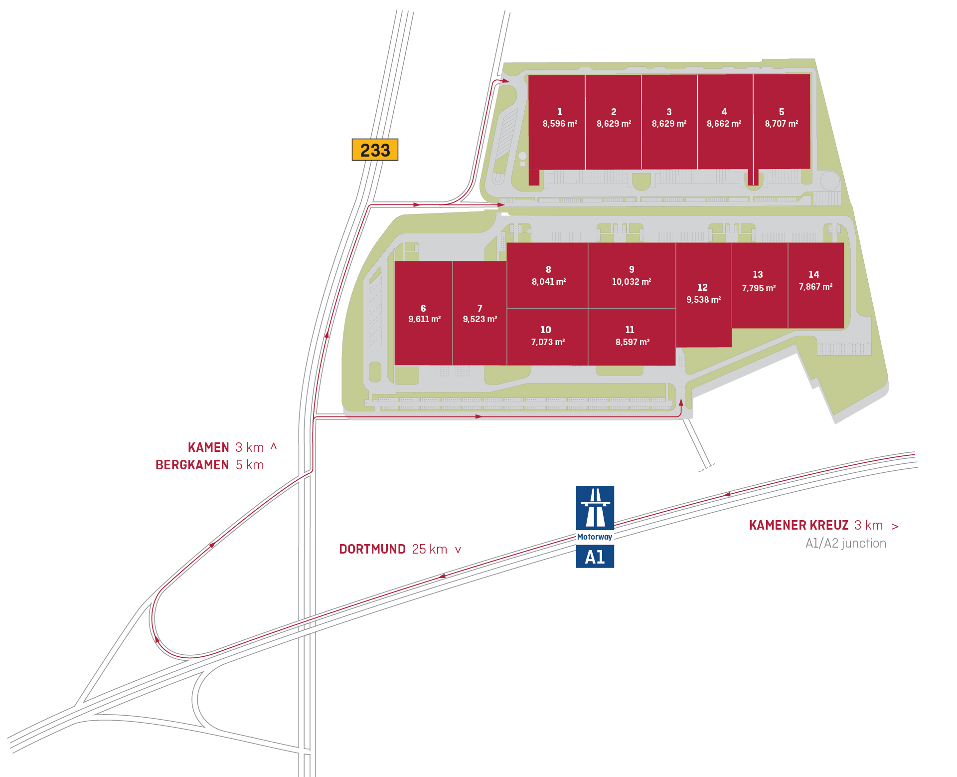 P3 Kamen se encuentra ubicado en la parte oriental de la zona del Ruhr, en el distrito de Unna, con excelentes conexiones por autopista. Está situado junto al cruce de Kamen, en la intersección de dos autopistas muy transitadas: la A1 para el tráfico norte-sur (Hamburgo-Colonia-Saarbrücken) y la A2 para este-oeste (Oberhausen-Hannover-Berlín). Los aeropuertos de Dortmund y Düsseldorf están a 13 y 40 km, respectivamente.