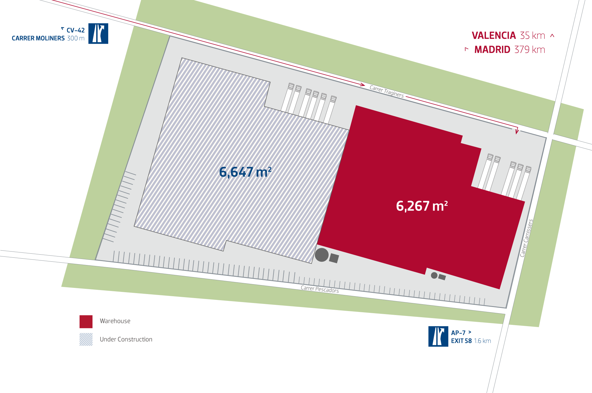 Valencia, situada en el centro de la costa este de España, es un lugar establecido para la actividad industrial, de fácil acceso a otras ciudades importantes de todo el país. Se trata de una propiedad industrial con un área total constuida de 6.721,49 m2, distribuida en 5,721.48 m2 de planta baja y 545,55 m2 correspondiente al primer piso. Estructura de acero y panel aislado de almacenamiento en frío. La nave está acondicionada para el almacenamiento en f´rio, siendo está la primera nave de frío de la cartera de activos de P3.