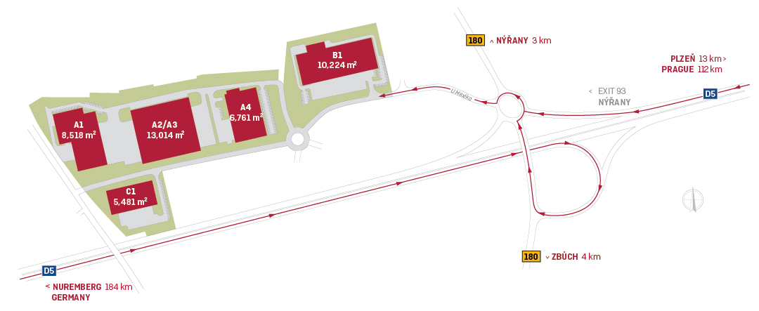 P3 Plzeň se encuentra a unos 12 km del centro de Plzeň, en la salida 93 de la autopista D5 (Praha - Plzeň - Alemania). La estación de tren está a menos de 2,5 km del lugar. El parque también es accesible en autobús público. La construcción de este parque logístico comenzó en 2007 y está compuesto por cinco naves. Los clientes más grandes del parque son Ranpak, HP-Pelzer, Yazaki Wiring Technologies Czech y WashTec..