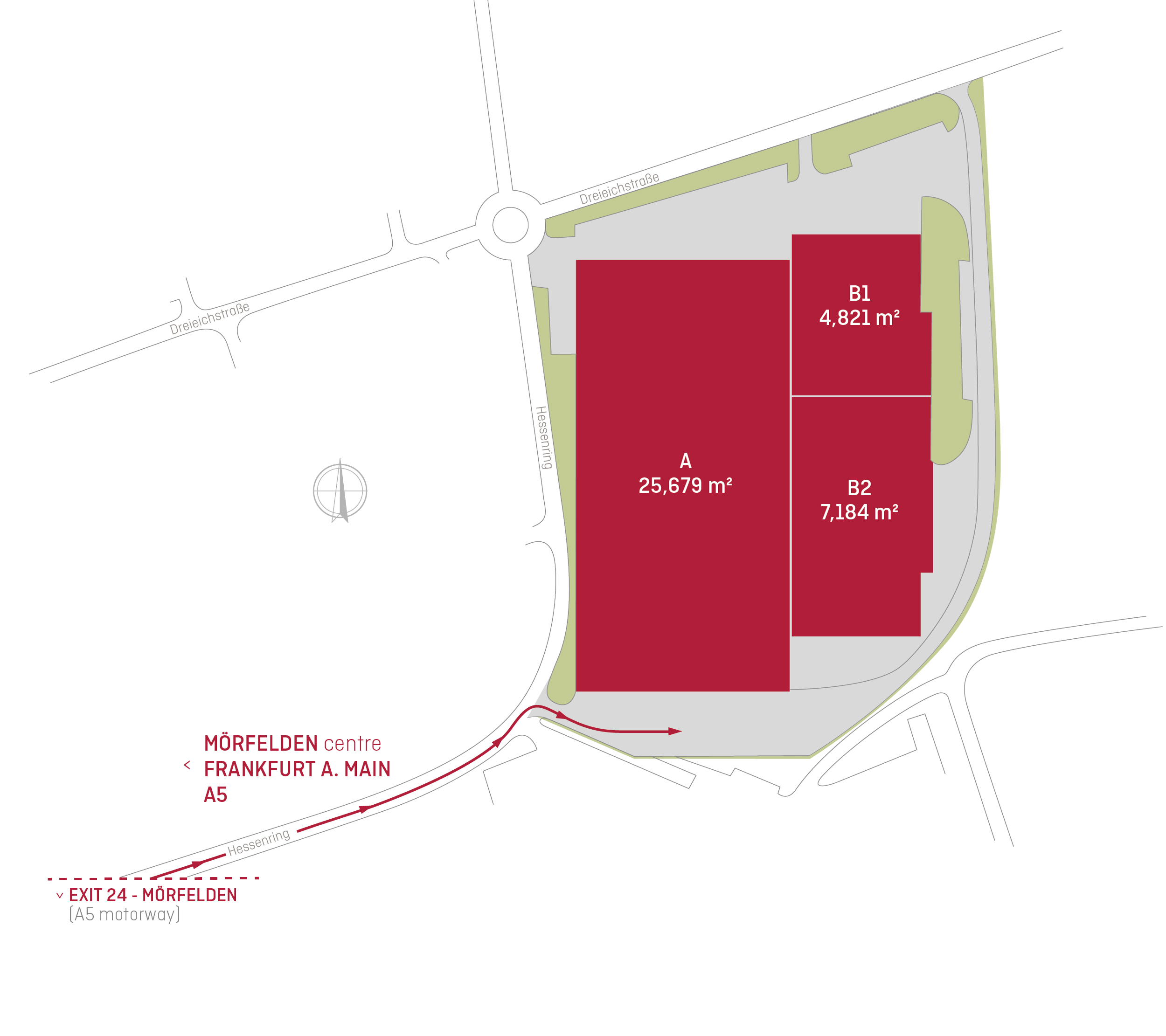 L’ensemble se situe à environ 20 km au sud du centre-ville de Francfort-sur-le-Main et à 10 km de l’aéroport de Francfort, tout près de l’autoroute A5. Le bâtiment mesure environ 100 mètres de large sur 200 mètres de long. La zone de bureaux principale est située à l’extrémité nord au-dessus du quai de déchargement. La hauteur libre au plafond est de 8,5 mètres. L’extension mesure environ 60 mètres de large sur 200 mètres de long. La hauteur libre au plafond est de 11,5 mètres. L’ensemble a été construit entre 1971 et 2007.