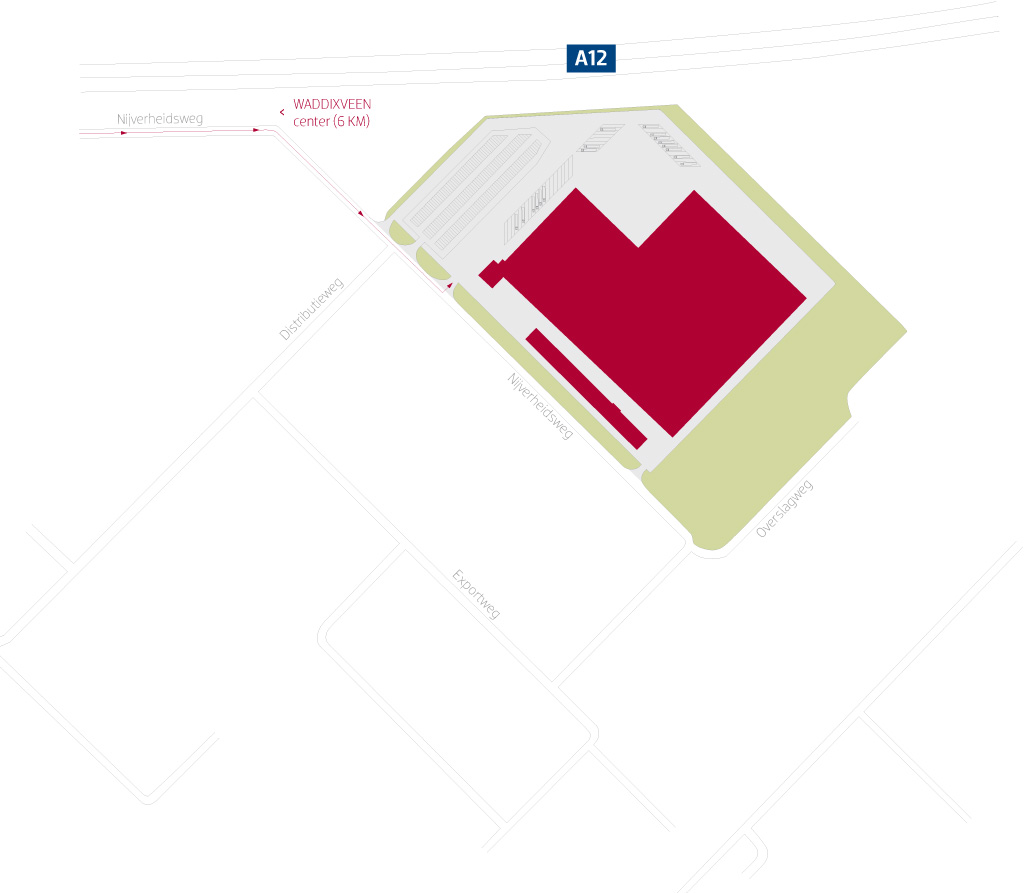 Waddinxveen se trouve au centre de la “Randstad”, la zone urbaine des Pays-Bas dans laquelle se trouvent les quatre plus grandes villes du pays : Amsterdam, Rotterdam, La Haye et Utrecht. Le bâiment est situé près de l’autoroute A12 à environ 1 km à l’ouest de la jonction de l’A12 et de l’A20 entre Rotterdam et Utrecht et à environ 15 km de Rotterdam, 20 km de La Haye, 30 km d’Utrecht et 60 km de l’aéroport de Schiphol à Amsterdam. Le site dispose d’une excellente visibilité depuis l’A12. . La charpente du bâtiment est en acier, les murs extérieurs sont constitués de panneau en aluminium, avec double vitrage sur châssis alu, et la toiture est recouverte d’une étanchéité bitumineuse. La construction date de 2006.