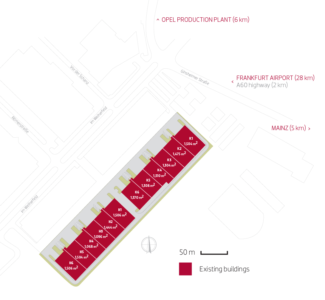 Il parco P3 Ginsheim-Gustavsburg è situato nella regione meridionale del Reno-Meno e fa parte del distretto di Groß-Gerau, servito dalle strade statali B42 e B44 e dall’autostrada A67. Francoforte dista circa 32 km tramite A67 e A3, Wiesbaden circa 33 km tramite A60 e A66, Magonza circa 28 km tramite A60 e A63. Grazie alla sua posizione centrale e alle ottime infrastrutture, il distretto di Groß-Gerau offre condizioni ideali per un sito commerciale. I settori chimico, aerospaziale, software, logistico e automobilistico sono ben rappresentati in questa zona.