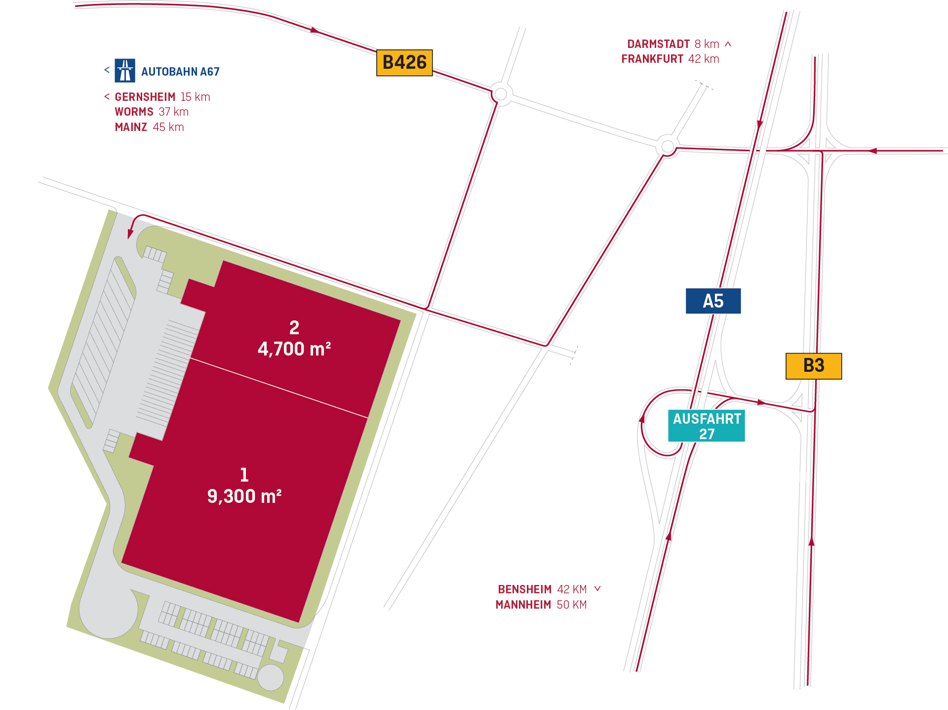 P3 Pfungstadt sits in the south of Hessen near Darmstadt and just south of Frankfurt. Situated within the Rhine‑Main area—one of Germany’s key logistics hotspots—it combines a metropolitan customer base of roughly five million people with direct motorway access. The A5 and A67 connect the park directly to the regional road network, enabling trucks to reach Darmstadt in around 20 minutes and Frankfurt in about 40 minutes.