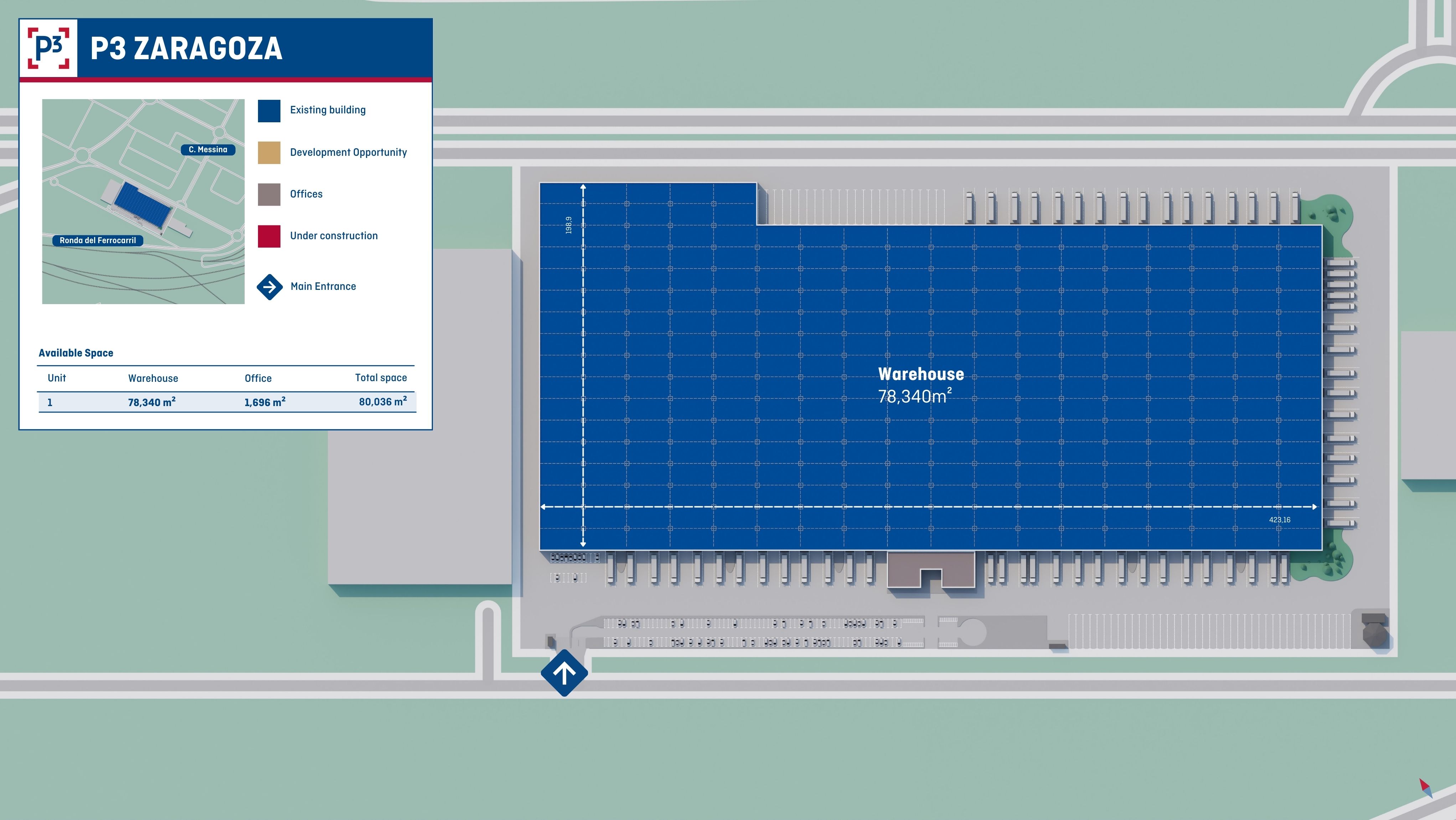 Located in the established industrial zone of Zaragoza in northeast Spain, the property is easily accessible to other prominent cities across the country. P3 Zaragoza is approximately 312 km west of Barcelona, via the AP2 / A2 motorway and 317 km northeast of Madrid, also via the A2. The property is situated in the Polígono Industrial Plaza, approximately 13 km southwest of the city centre near the Zaragoza airport. The SPAR railway line borders the site to the north, servicing distribution requirements. Major companies in the area include AEV, Somvital Biosafety, Pronimetal, JVC Shipping Solutions and TXT. The wider estate also features Intidex, DHL Express and Kuehne & Nagel.