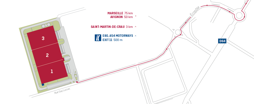 Parcul logistic P3 Saint-Martin-de-Crau este amplasat la 35 km de Terminalul de Containere din Marseille Fos Sea Port. St Martin de Crau este una dintre zonele logistice cheie pentru sudul Franţei. Clădirea este autonomă, cu 3 compartimente a câte 6.000 m². Accesul către acest parc se face prin A54/N113 (ieşirea 11), precum și A55/N568.
